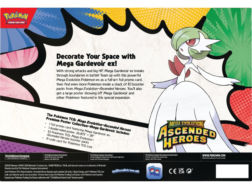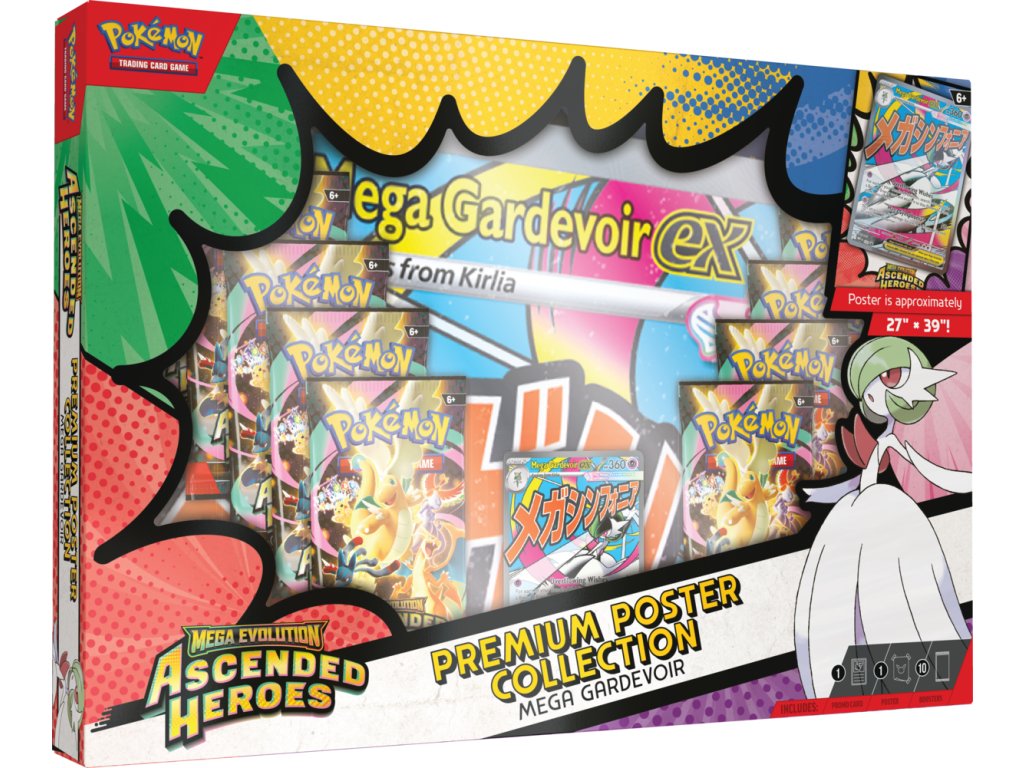 Pokémon TCG: ME02.5 Ascended Heroes – Premium Poster Collection je prémiové balení edice Mega Evolution – Ascended Heroes, které obsahuje 10 boosterů, foilovou promo kartu a velký oboustranný plakát.