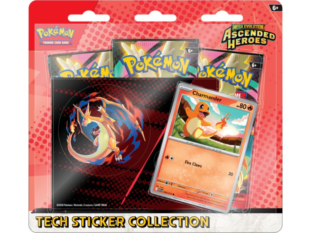 Sběratelská karetní hra Pokémon TCG: Mega Evolution – Ascended Heroes Charmander Tech Sticker Collection přináší do sbírky hráčů unikátní designy a motivy inspirované ikonickým postojem Charmandera v dynamické atmosféře éry Mega Evolution. Každé balení obsahuje specificky laděné boostery s různými artworky na obalech, které odrážejí témata edice.
